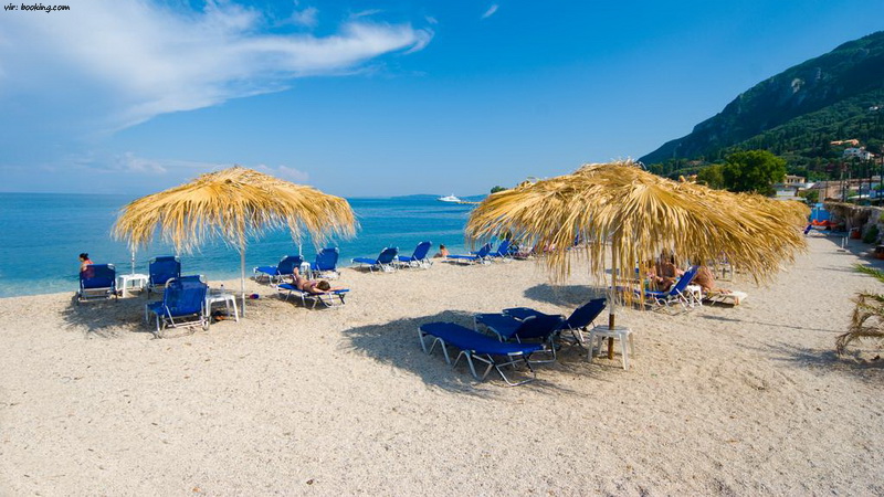 Lega: ob prodnato peščeni plaži (vmes cesta), v bližini vsega dogajanja, 9 km od mesta Krf in 11 km od letališča.