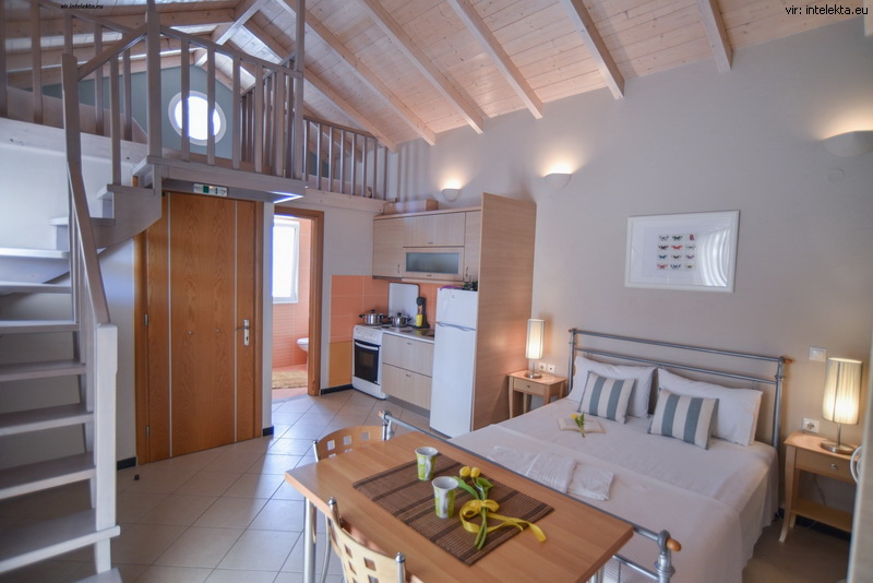Nastanitev: Vsi prostorni, 30m2 veliki, stilsko opremljeni studii, ki se ponašajo z veliko naravne svetlobe, imajo kopalnico s tušem, WC, sušilnik za lase, samostojno nastavljivo klimatsko napravo, sef, TV, brezplačen WiFi, kombiniran dnevno-spalni prostor s kuhinjskim kotičkom s pečico ter balkon ali teraso s pogledom na bazen. Apartmaji so opremljeni enako, le da so prostornejši oz. veliki kar 54 m2, imajo kopalnico s kadjo ter ločeno spalnico. Čiščenje vsak dan, menjava brisač in posteljnine dvakrat tedensko.